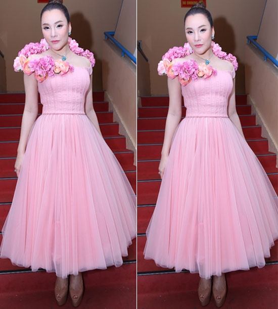 | Chiếc váy hồng xòe cộng thêm dải hoa trên cổ làm Hồ Quỳnh Hương rất "quê mùa". |