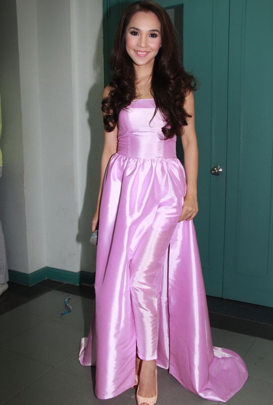| Dù mặc váy đắt đỏ nhưng Huyền Ny lại không "ghi điểm" khi khoác lên mình chiếc váy hồng chất liệu nhăn và nhiều chi tiết này. |