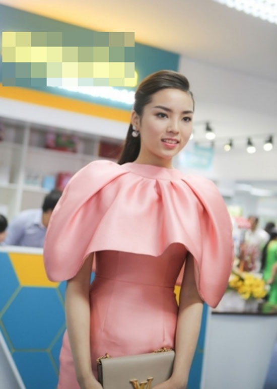 | Váy hồng với phần cổ áo cao, lòe xòe khiến tổng thể thân hình Hoa hậu Kỳ Duyên mất cân đối và kém tinh tế. |