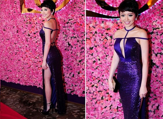 | Tóc Tiên xây dựng phong cách thời trang nóng bỏng và cô nhận được nhiều lời khen ngợi của công chúng. Váy tím thiết kế xẻ đùi, cut-out tại ngực, lưng giúp cô hoàn toàm làm mê mẩn bất cứ ánh nhìn nào. |