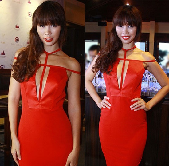 | Hot girl Kelly Tú Anh trở thành tâm điểm của báo giới nhờ chiếc váy trắng hở eo, vai và ngực. |