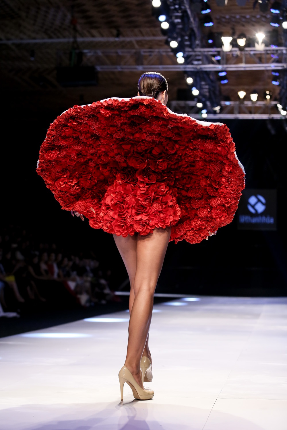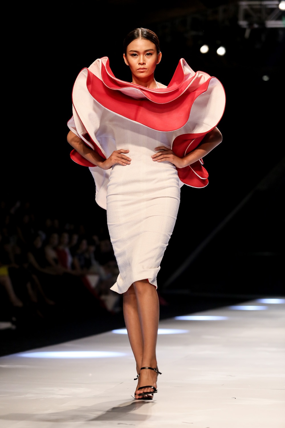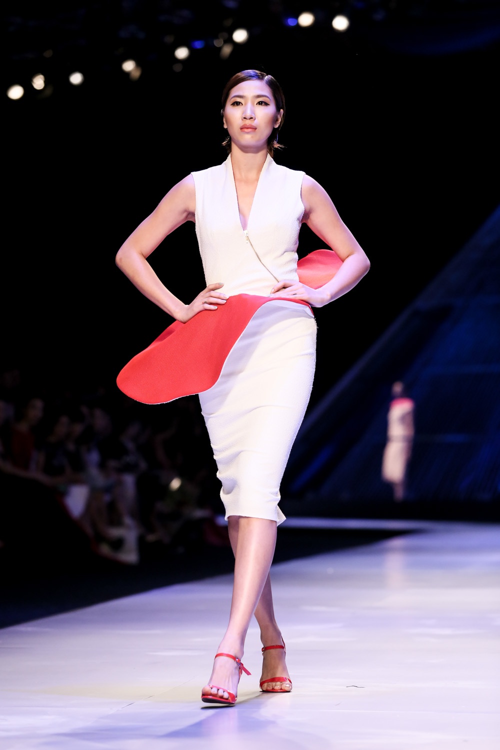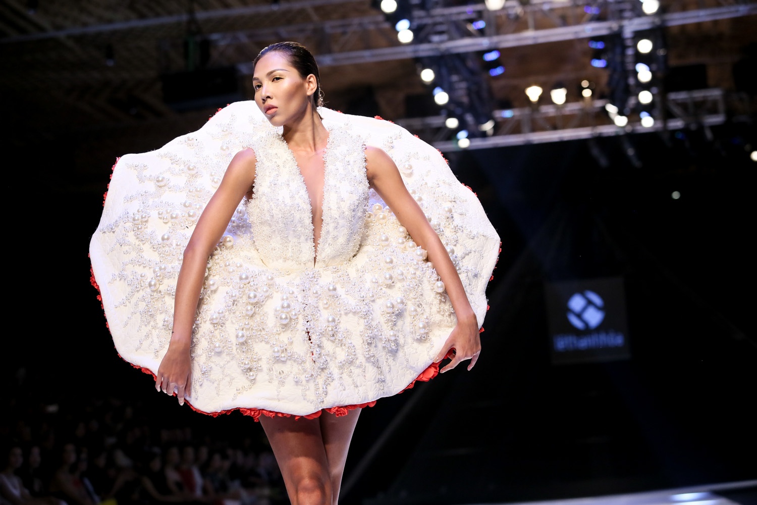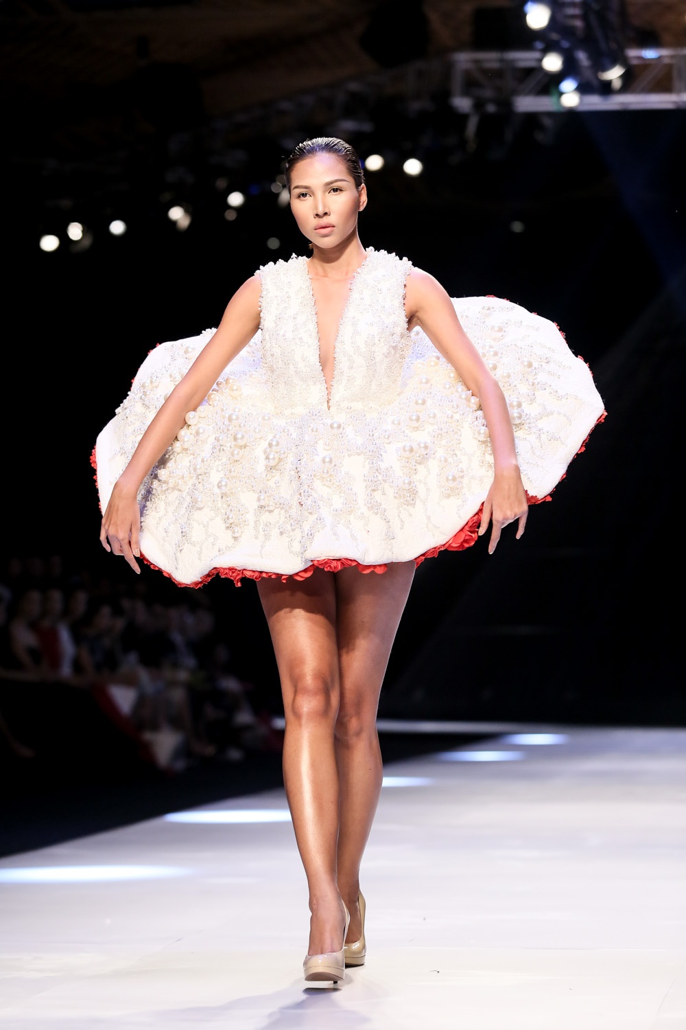 | Kết màn show diễn, vedette Minh Triệu diện một thiết kế độc đáo. Thân trước đính hoa nhỏ, đan xen hạt ngọc trai tinh xảo. Phần thân sau tùng váy được cắt ghép từ nhiều bông hoa hồng, tạo sự đối lập giữa hai tông màu trắng - đỏ. Khi thể hiện mẫu thiết kế này, Minh Triệu cảm thấy khó khăn khi tạo dáng và di chuyển. Thay vào đó, cô tạo điểm hút cho phần trình diễn bằng gương mặt lạnh, đôi mắt sắc bén. |