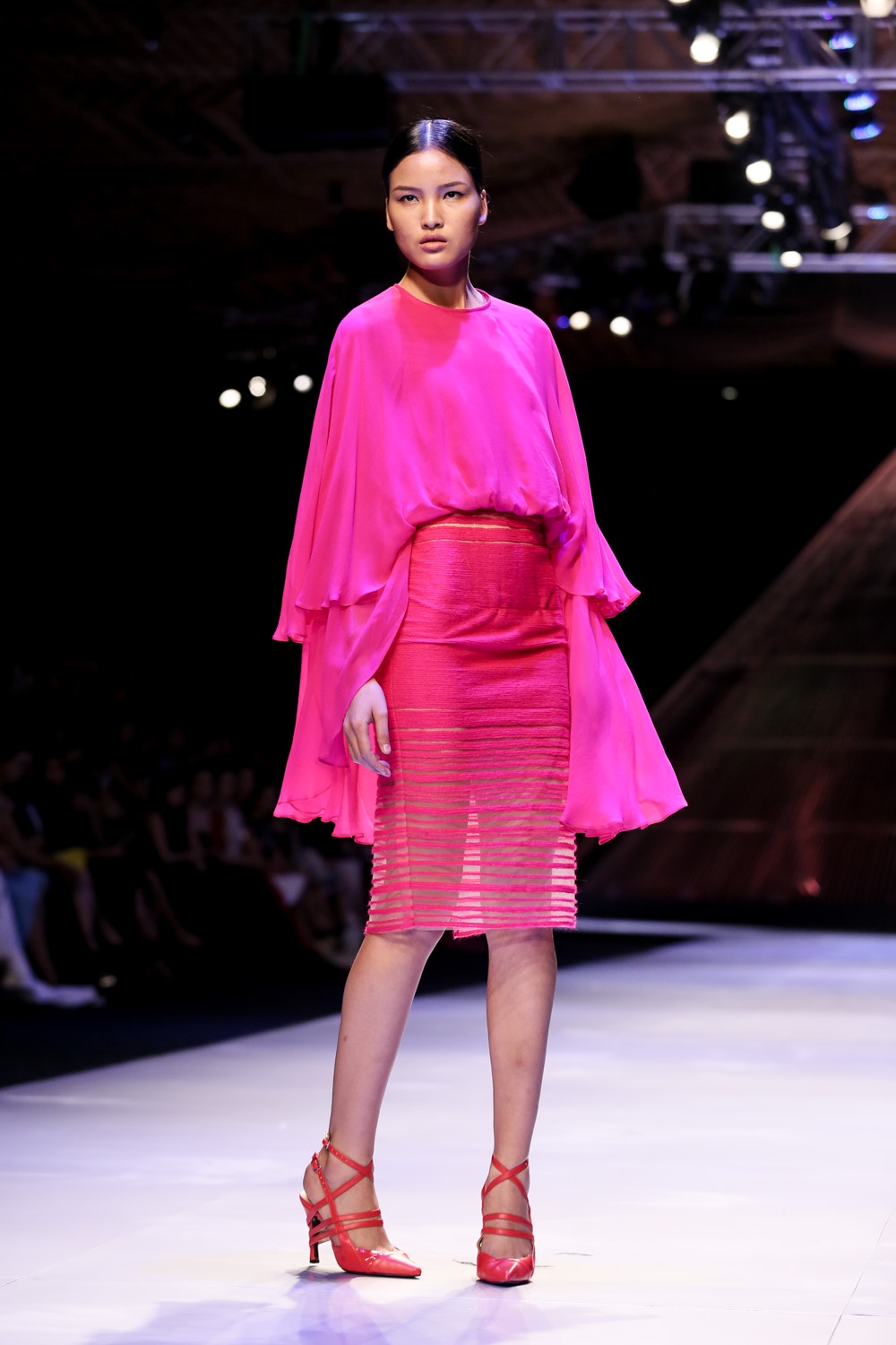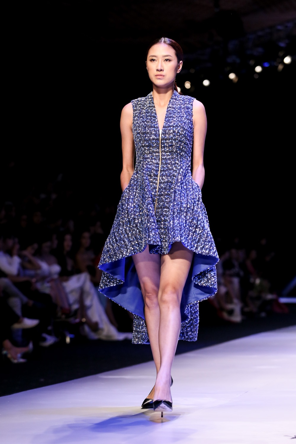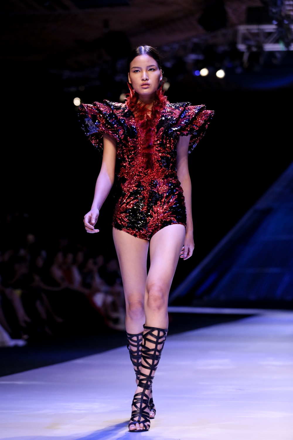 | BST bắt đầu với những thiết kế đầm bút chì đơn giản màu đen đính gai nhọn thành mảng lớn cực kì bắt đèn sân khấu. Sau đó là những thiết kế body suit ấn tượng có điểm nhấn ở vai, đính kết dày đặc kim sa hoặc xếp bèo nhuyễn tạo khối 3D. |