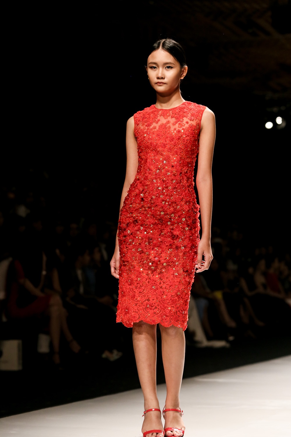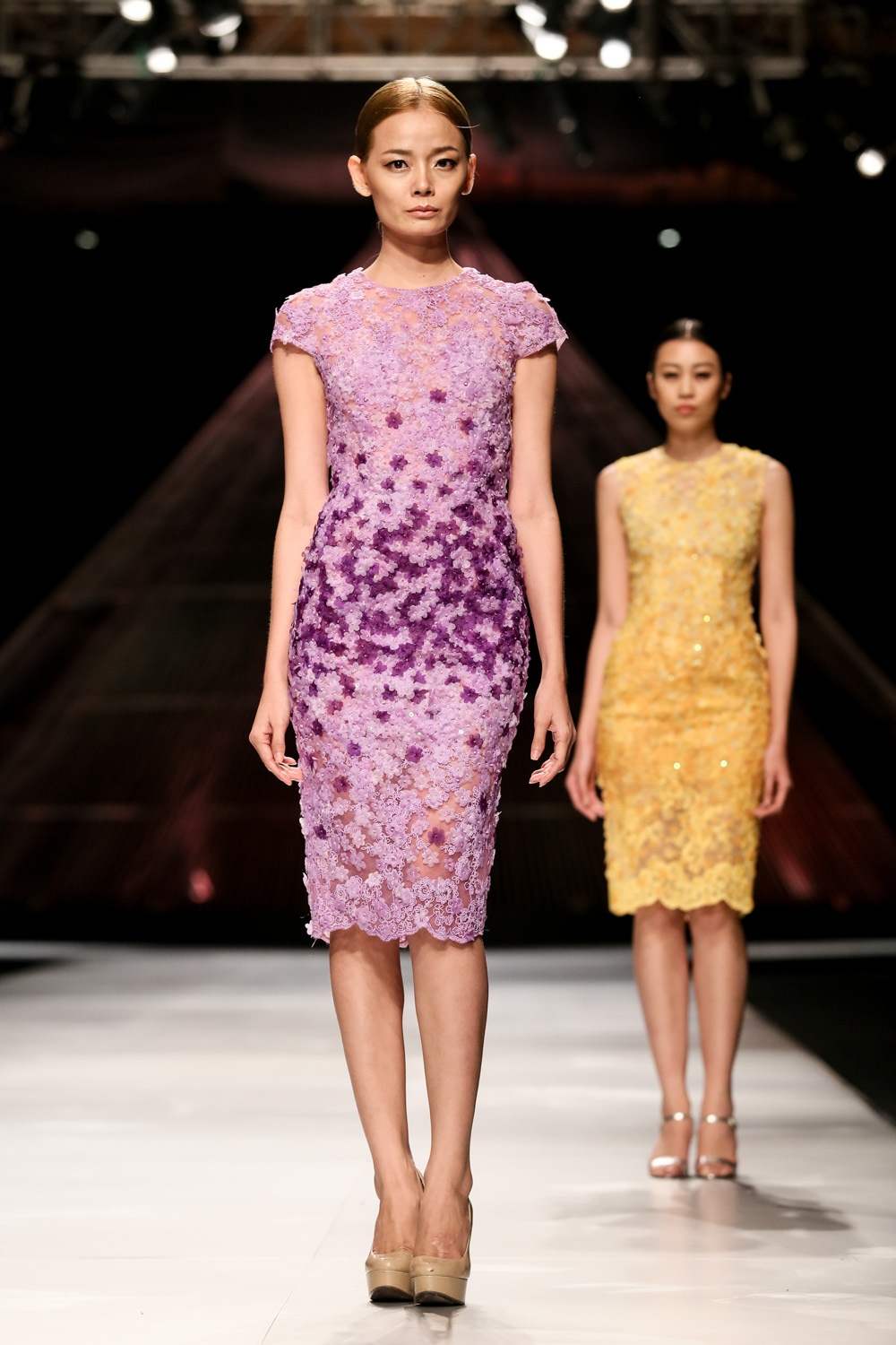 | Ở một vài kiểu đầm, NTK khai thác kĩ thuật cắt laser những bông hoa li ti rồi đính đặc tạo bề mặt chất liệu mới và chất cảm thú vị hơn cho BST. Chi tiết những đường kẻ song song khít khít nhau rồi thưa dần trên nền vải trong suốt thấp thoáng gợi cảm được sử dụng cho những dáng váy bút chì bó sát đường cong phái đẹp. |