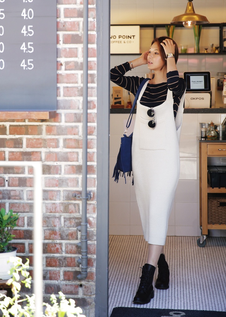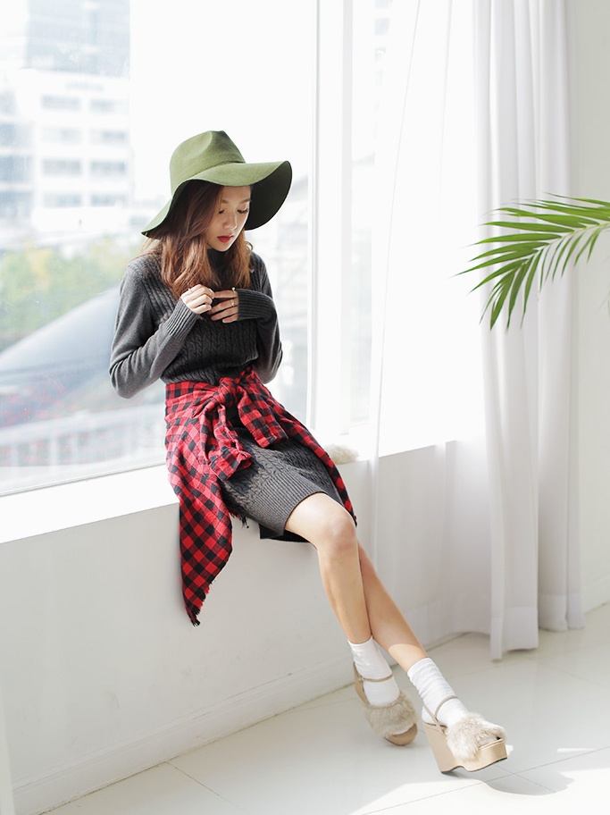 Bạn có thể mix kèm sơ mi kẻ buộc ngang hông để tăng vẻ hiện đại cho váy len.