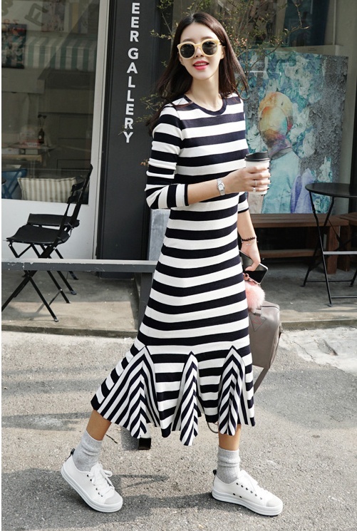 Một chút khác biệt với váy len đuôi chuông và họa tiết kẻ ngang nghịch ngợm.