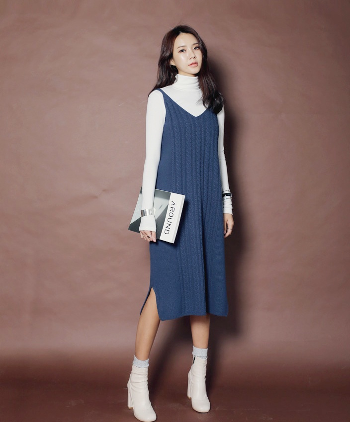 | Váy len 2 dây điệu đà mix kèm áo len cao cổ thích hợp cô nàng nữ tính. |