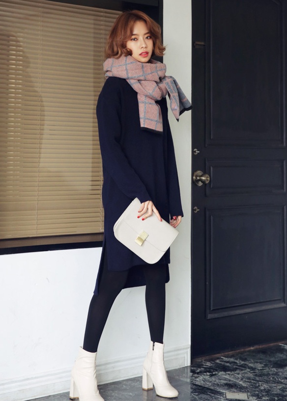 | Váy len dáng suông xẻ sâu và khăn khổ lớn rất thích hợp cô nàng cá tính. |