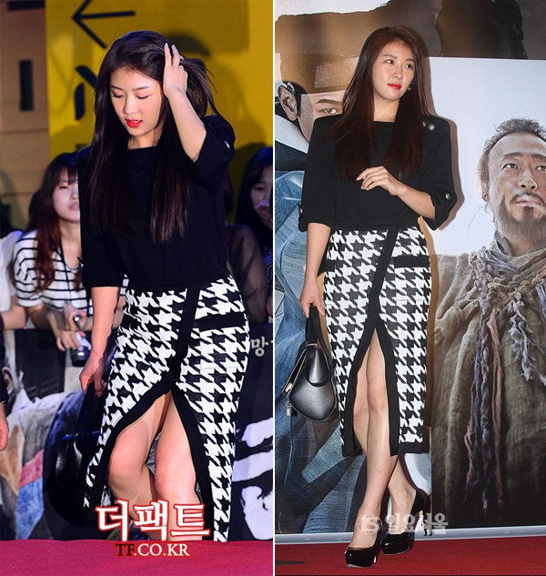 | Trường hợp của nữ diễn viên Na Ha Kyung là sản phẩm được sắp đặt trước. Cô cố tình diện bộ váy sexy xẻ cổ sâu, tà váy cao khi tham dự sự kiện Rồng xanh và té ngã tại đây để gây sự chú ý. |