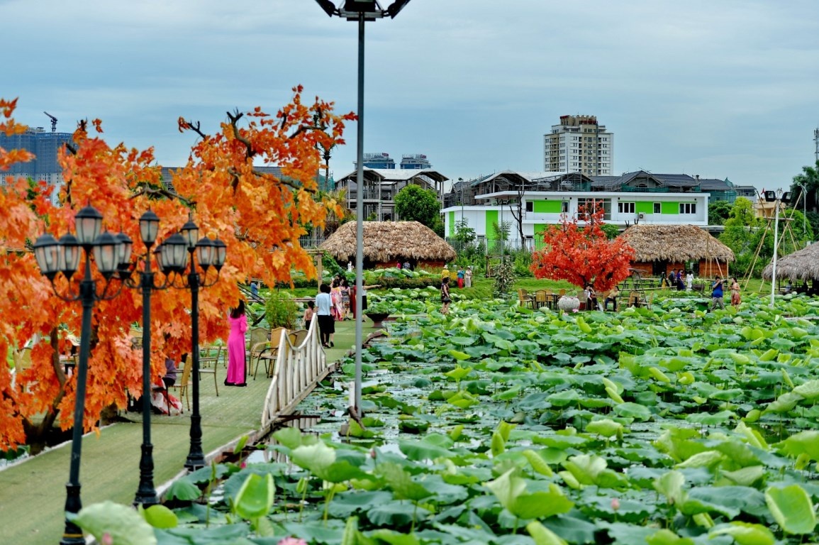 | Hoa sen ở đây phong phú nhiều chủng loại như sen quan âm, sen trắng, sen bách diệp. Ngoài ra còn những luống hoa đẹp khác đang nở như hoa hồng, hoa cúc vàng… Các khoảng không giữa hồ có thảm cỏ rộng lớn vừa tạo không gian cho người đến chụp ảnh vừa là nơi cho trẻ em chạy nhảy. |