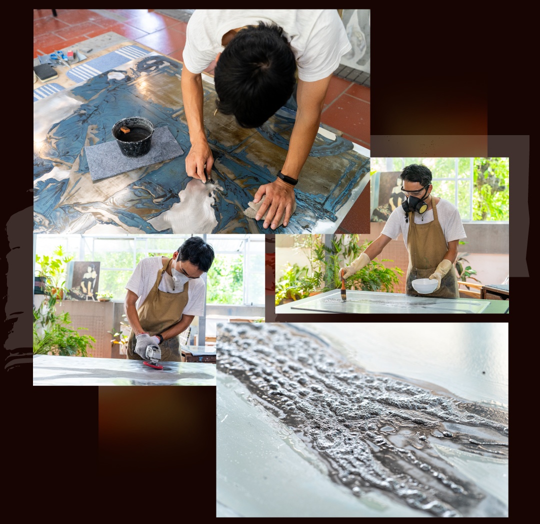 - Việc lựa chọn chất liệu sơn mài kết hợp kỹ thuật ăn mòn axit trên bề mặt hợp kim nhôm mang lại hiệu quả nghệ thuật gì trong việc truyền tải thông điệp của tác phẩm “Gắn kết tạm thời”?