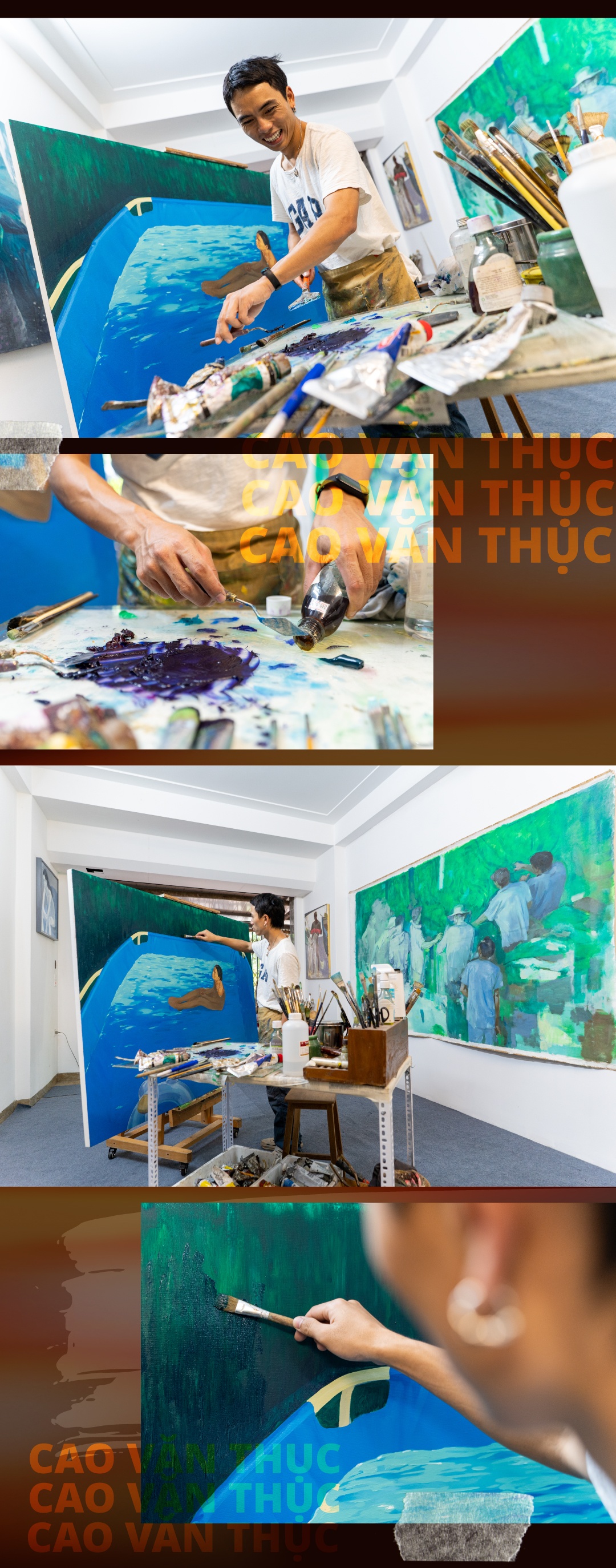 - Do nhu cầu về biểu đạt, tôi muốn biết cần phải kể câu chuyện ấy theo cách nào. Bình thường, tôi vẫn sử dụng sơn dầu hay sơn mài làm chất liệu chính trong thực hành hội họa. Nhưng với hình ảnh này, tôi nghĩ cần thể hiện sao cho truyền tải đúng tinh thần, kể câu chuyện một cách hiệu quả.