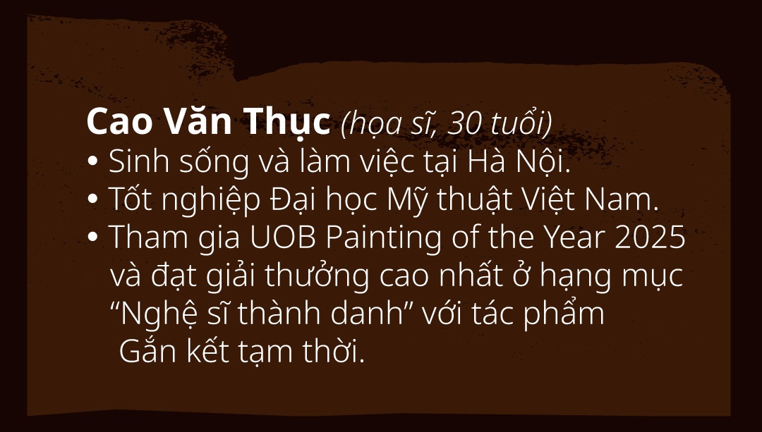 Thông qua tác phẩm Gắn kết tạm thời, ngôn ngữ nghệ thuật của chàng họa sĩ trẻ đã chạm tới trái tim nhiều người. Giải thưởng UOB Painting of the Year 2025 như cột mốc quan trọng cho hành trình theo đuổi hội họa bằng tình yêu thuần khiết của Cao Văn Thục.
