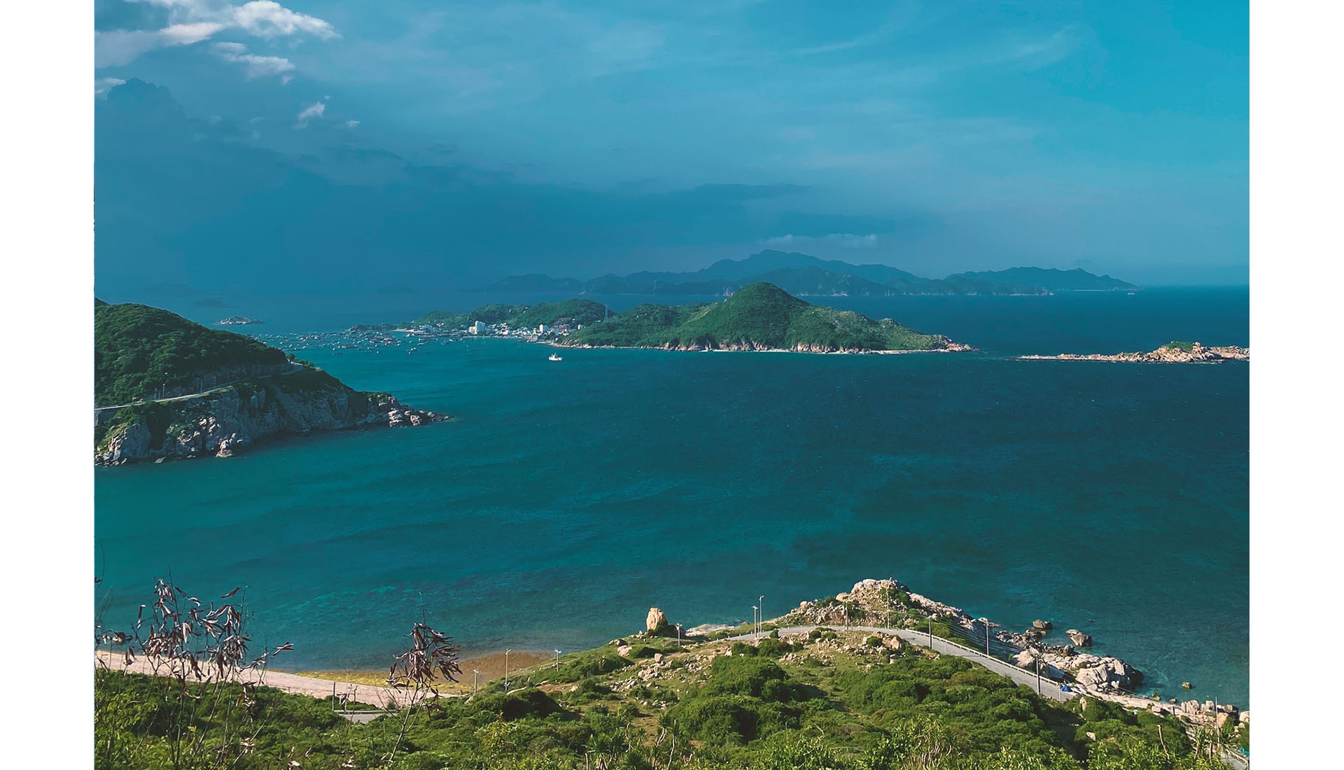 | Đi dọc theo cung đường ven biển, một bên là màu xanh êm ả của vùng biển bao la, một bên là cảnh núi rừng bát ngát hùng vĩ. |