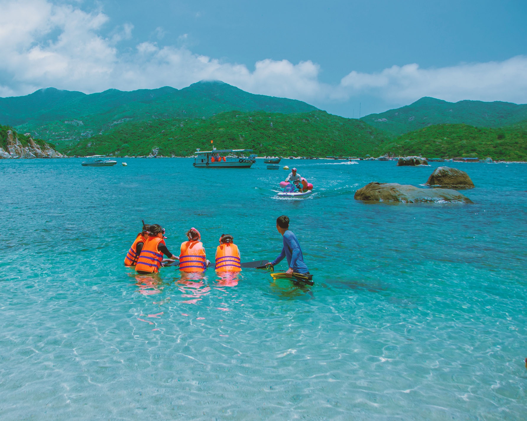 Sau đó, nhóm tiếp tục lịch trình đi cano ra vịnh ngắm san hô. Lúc này đã giữa buổi sáng, mặt trời cũng đã lên cao và cái nóng bắt đầu gay gắt hơn.