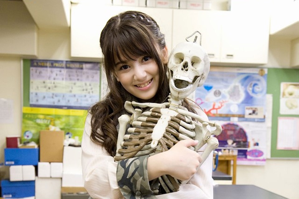 | Dù sợ hãi ban đầu nhưng Oku vẫn tạo dáng với cả bộ xương này. |