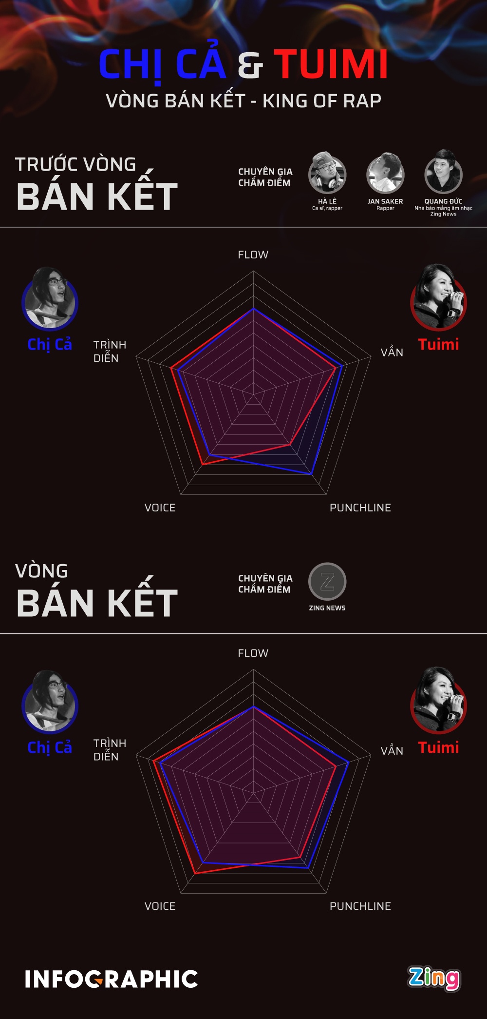 Kỹ thuật gieo vần và punchline của Tuimi không bằng Chị Cả. Song, ở vòng Bán kết, cô gây ấn tượng về flow, chất giọng và trình diễn.