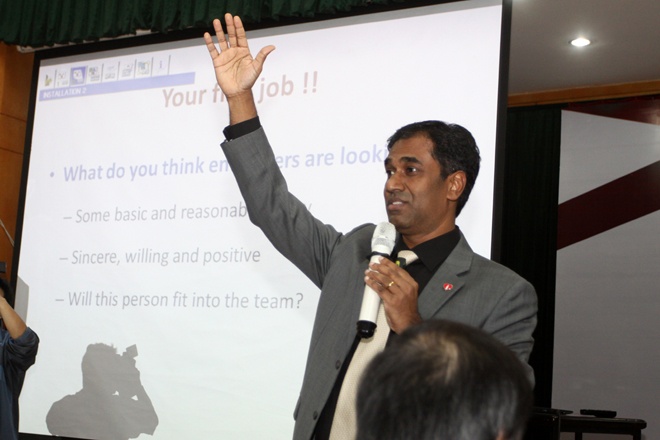 Trong cuộc tọa đàm, nhiều bạn sinh viên tỏ ra lo lắng sẽ tìm việc ở đâu sau khi tốt nghiệp, nhưng ông Vamsi cho rằng những năm đầu tiên, điều quan trọng là phải học cách quản lý định hướng và công việc của mình.