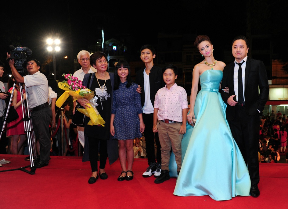 Victor Vũ - Đinh Ngọc Diệp xuất hiện trên thảm đỏ cùng bộ ba diễn viên nhí và biên kịch Việt Linh. Ảnh: Lý Võ Phú Hưng |