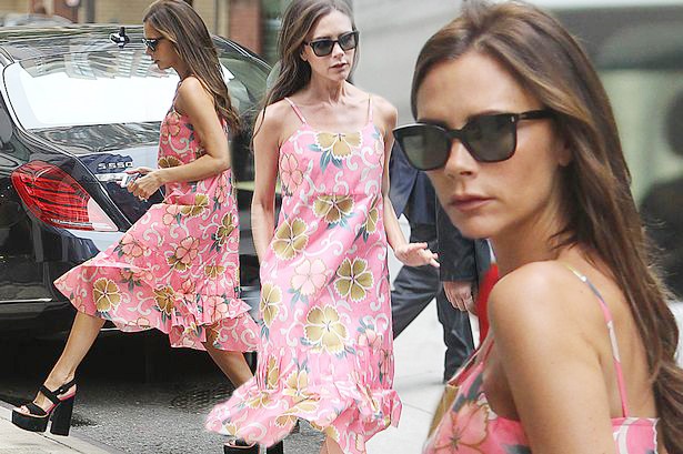 Thay cho những bộ đầm bodycon đậm chất formal, Vic xuất hiện trên đường phố với chiếc váy hồng mang ảnh hưởng của thập niên 60 và đôi sandals platform gợi nhớ tới hình ảnh của Spice Girls.