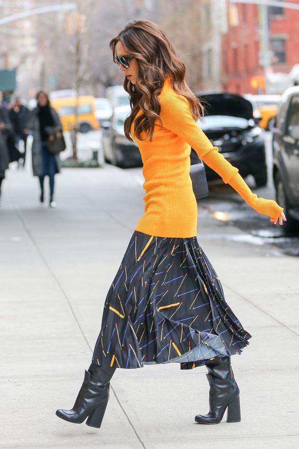 Tạm thời rời xa gu màu đen huyền bí yêu thích, Vic thắp sáng không khí mùa đông bằng trang phục gồm áo len tăm màu cam và chân váy xếp ly pha họa tiết cam ăn ý. |