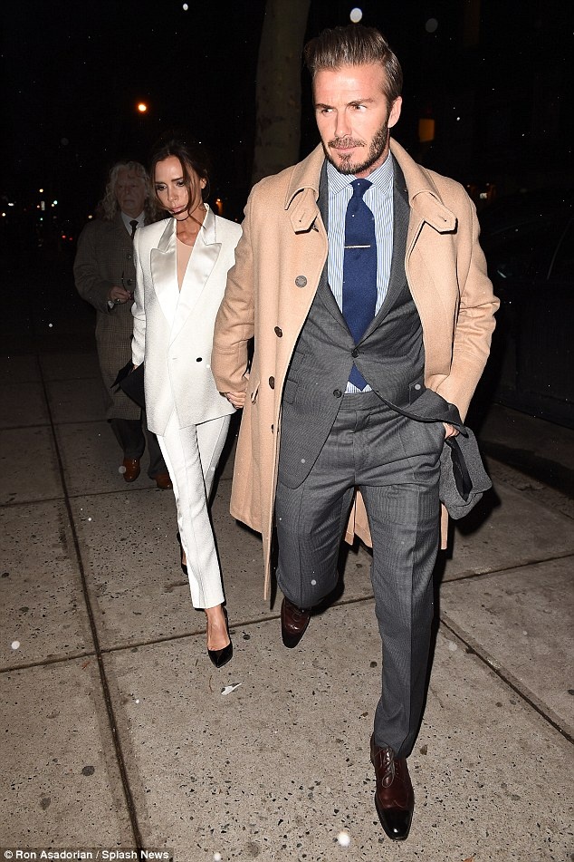 Dù bận bịu, Vic không quên dành thời gian cho gia đình. Buổi tối cùng ngày, nhà thiết kế và ông xã David Beckham đi ăn tối tại một nhà hàng. Cặp đôi cùng đóng bộ suit, David nắm tay bà xã bước đến nơi đỗ xe. |
