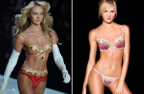 | Mẫu Royal Fantasy Bra gốc được Candice Swanepoel trình diễn trong show thời trang và phiên bản "ăn theo" (phải). |