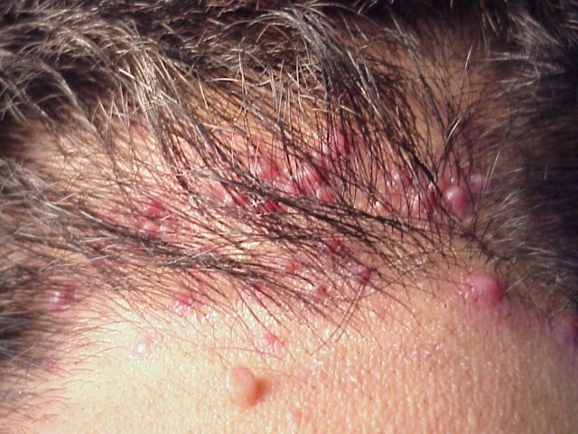 Khi bị nhiễm, da sẽ biến đổi giống như “nổi da gà”, các nang lông chứa đầy mủ (mụn mủ), đỏ, ngứa, với một sợi lông/tóc ở trung tâm mụn đỏ đó. Thỉnh thoảng mụn này có thể vỡ, chảy ra dịch màu trong hoặc vàng nhạt.