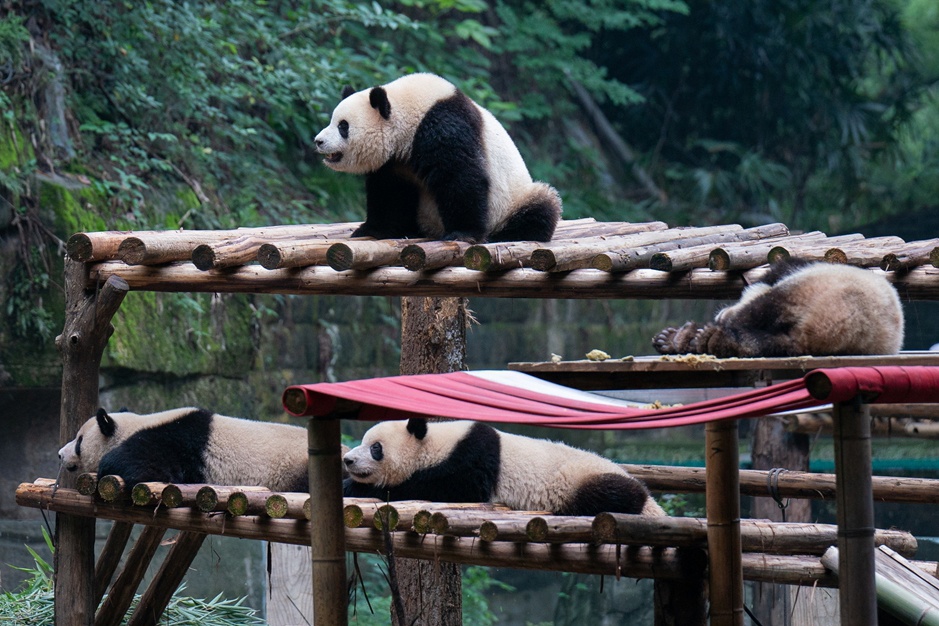 Những chú gấu trúc khổng lồ nghỉ ngơi tại một sở thú ở Trùng Khánh, Tây Nam Trung Quốc. Ảnh: VCG. |