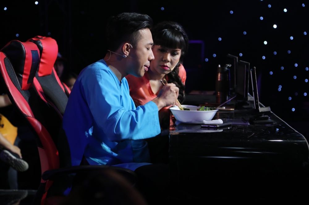 | Lịch làm việc liên tục nên thời gian đối với Trấn Thành vô cùng "eo hẹp". Trước khi quay chương trình, ngồi trên ghế nóng, anh tranh thủ lót dạ bằng tô hủ tiếu. |