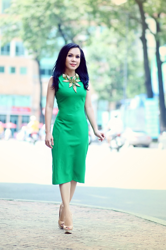 | Để phù hợp với hình ảnh thanh lịch, Việt Hương còn mang giày cao gót, trang điểm tông màu bắt mắt và để tóc suông thẳng phù hợp. |