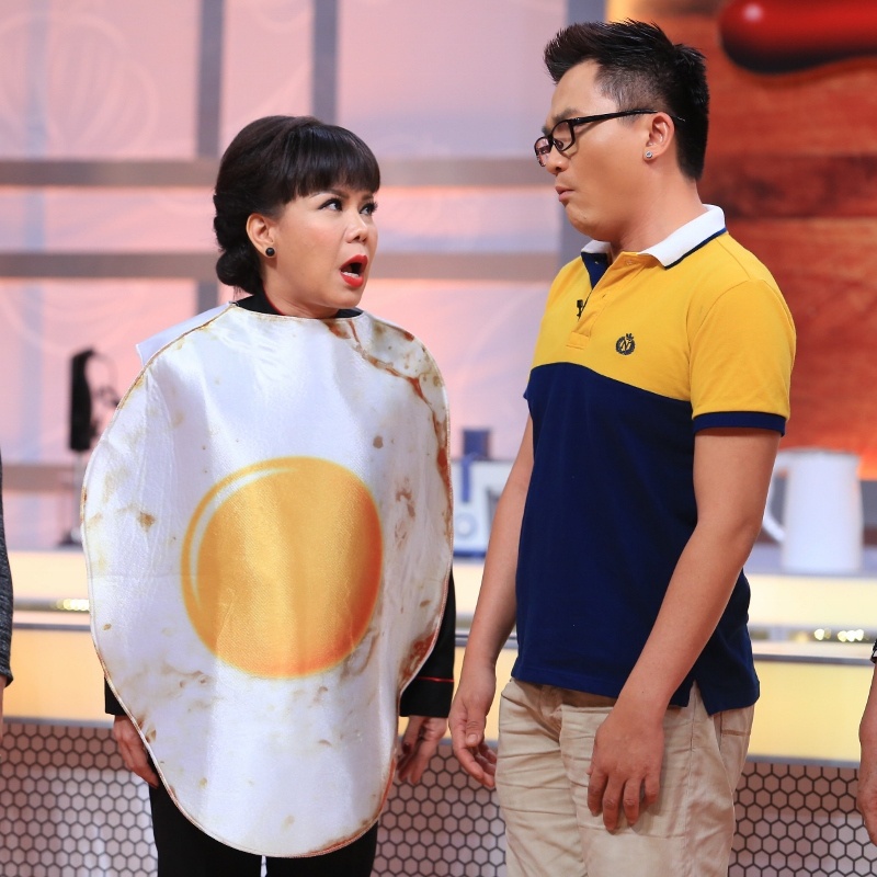 | Trang phục trứng ốp la của nữ MC một lần nữa là chủ đề để đối thủ Đại Nghĩa bàn tán, đá xéo. |