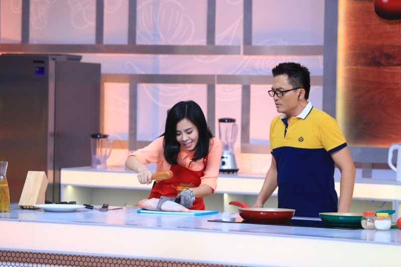 | Nữ diễn viên Vũ Ngọc Ánh trổ tài nấu món cá diêu hồng. Đây là lần đầu tiên cô vào bếp vì bình thường, việc nấu nướng mẹ đảm nhận. |