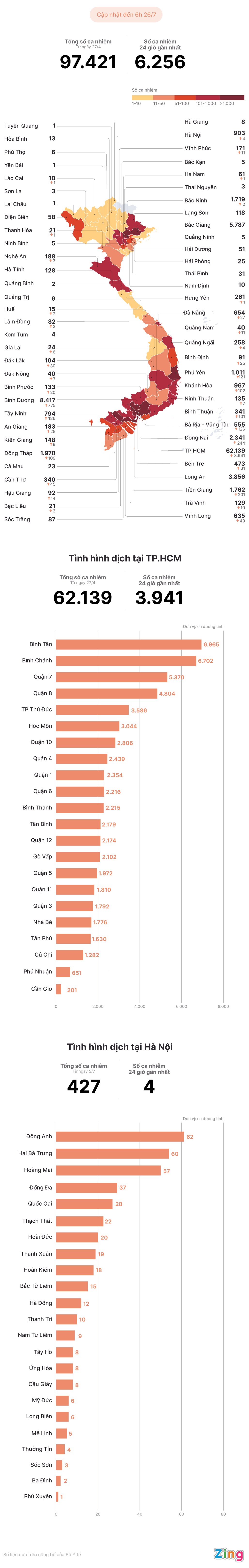 Từ ngày 27/4 đến nay, Việt Nam ghi nhận 97.421 người mắc Covid-19. Dịch tại TP.HCM vẫn diễn biến rất phức tạp với số lượng lớn bệnh nhân được phát hiện mỗi ngày.