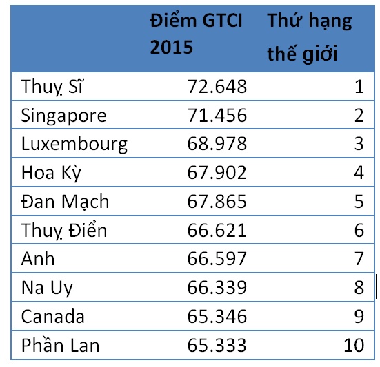 Top 10 thế giới về chỉ số cạnh tranh tài năng toàn cầu GTCI 2015. Nguồn trích từ báo cáo GTCI 2015.