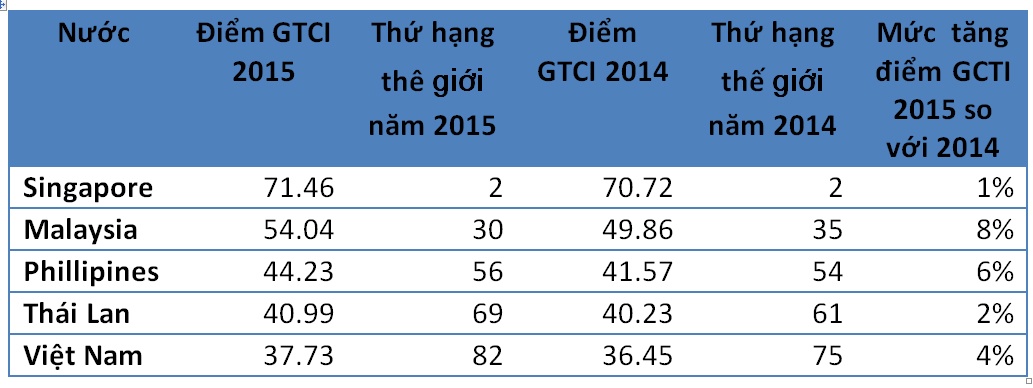 Kết quả chỉ số GCTI tại 5 nước hàng đầu khu vực Đông Nam Á năm 2014-2015. Nguồntrích từ báo cáo GTCI 2015. |