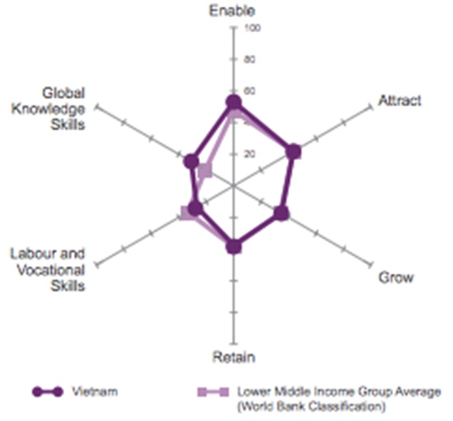 Theo một báo cáo dài 346 trang mới được công bố tại Davos, Thuỵ Sỹ, Việt Nam xếp hạng 82 thế giới, thứ 5 khu vực Đông Nam Á và thứ chín trong nhóm các nước có mức thu nhập trung bình thấp (lower middle income countries) về chỉ số cạnh tranh tài năng toàn cầu (GTCI – Global Talent Competittiveness Index) năm 2015.