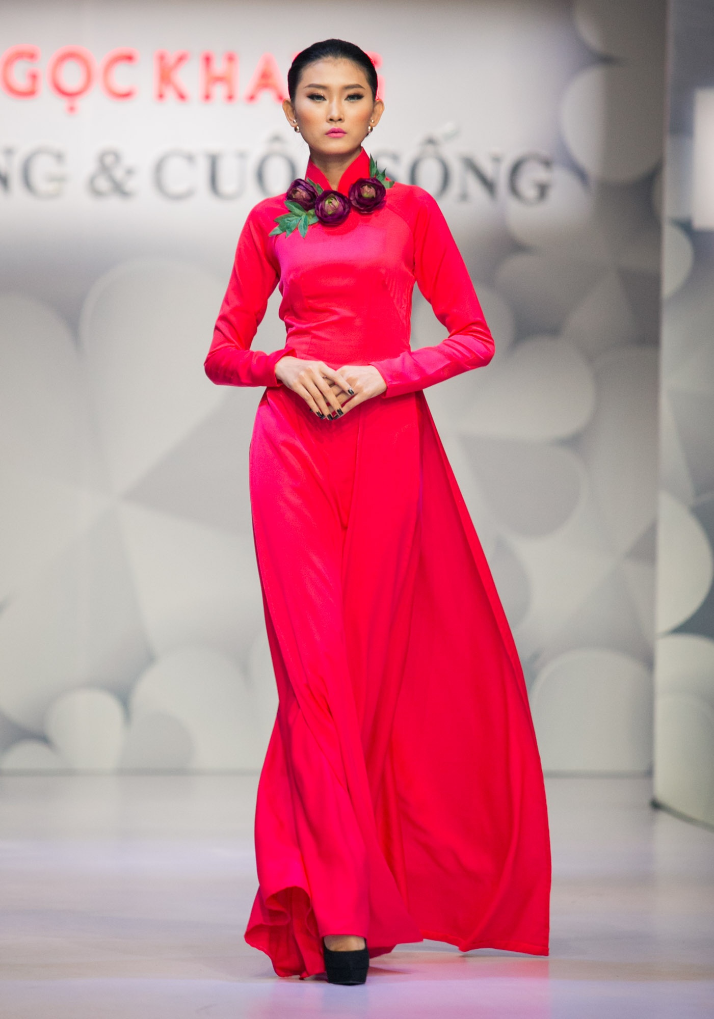 | Áo dài tông màu hồng đỏ tôn nước da trắng sáng của người mặc. |