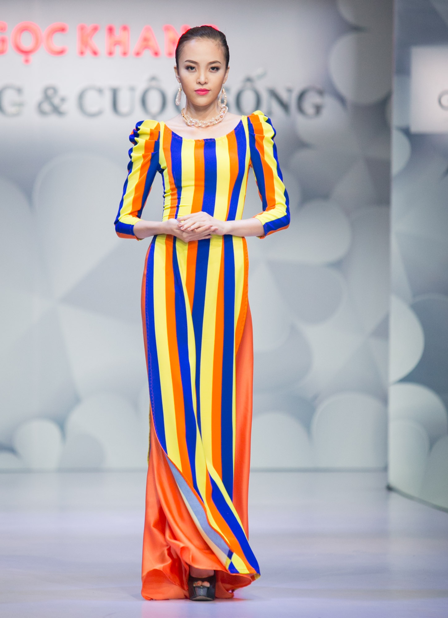 | Người đẹp Kỳ Hân sải bước duyên dáng khi diện mẫu áo dài sọc kẻ tông màu bắt mắt. |