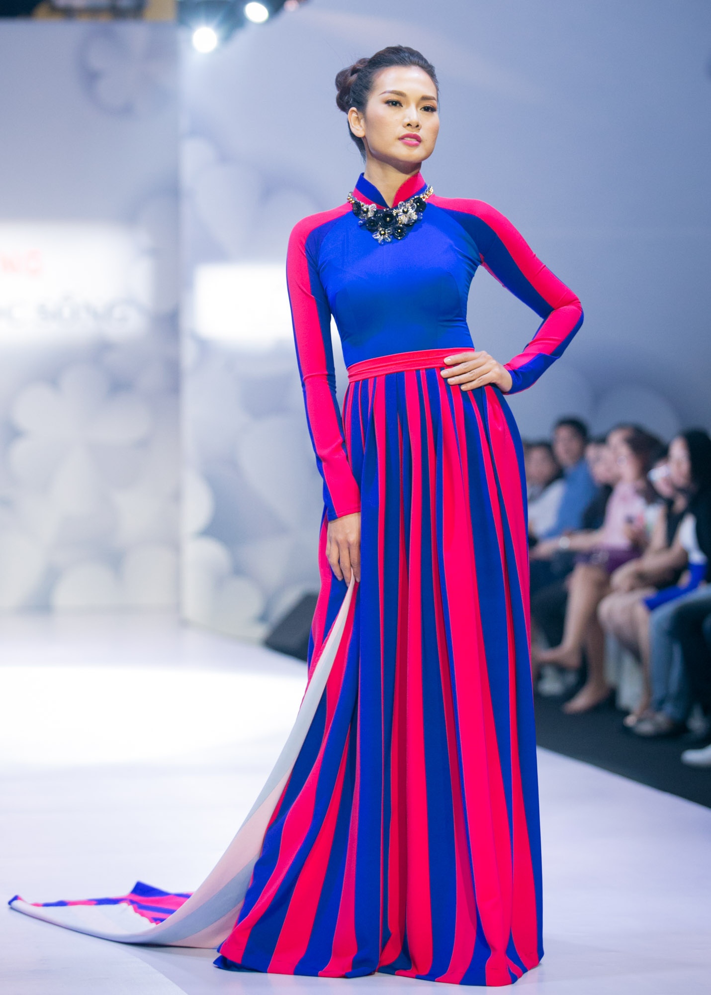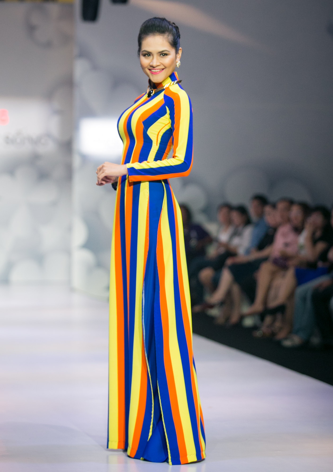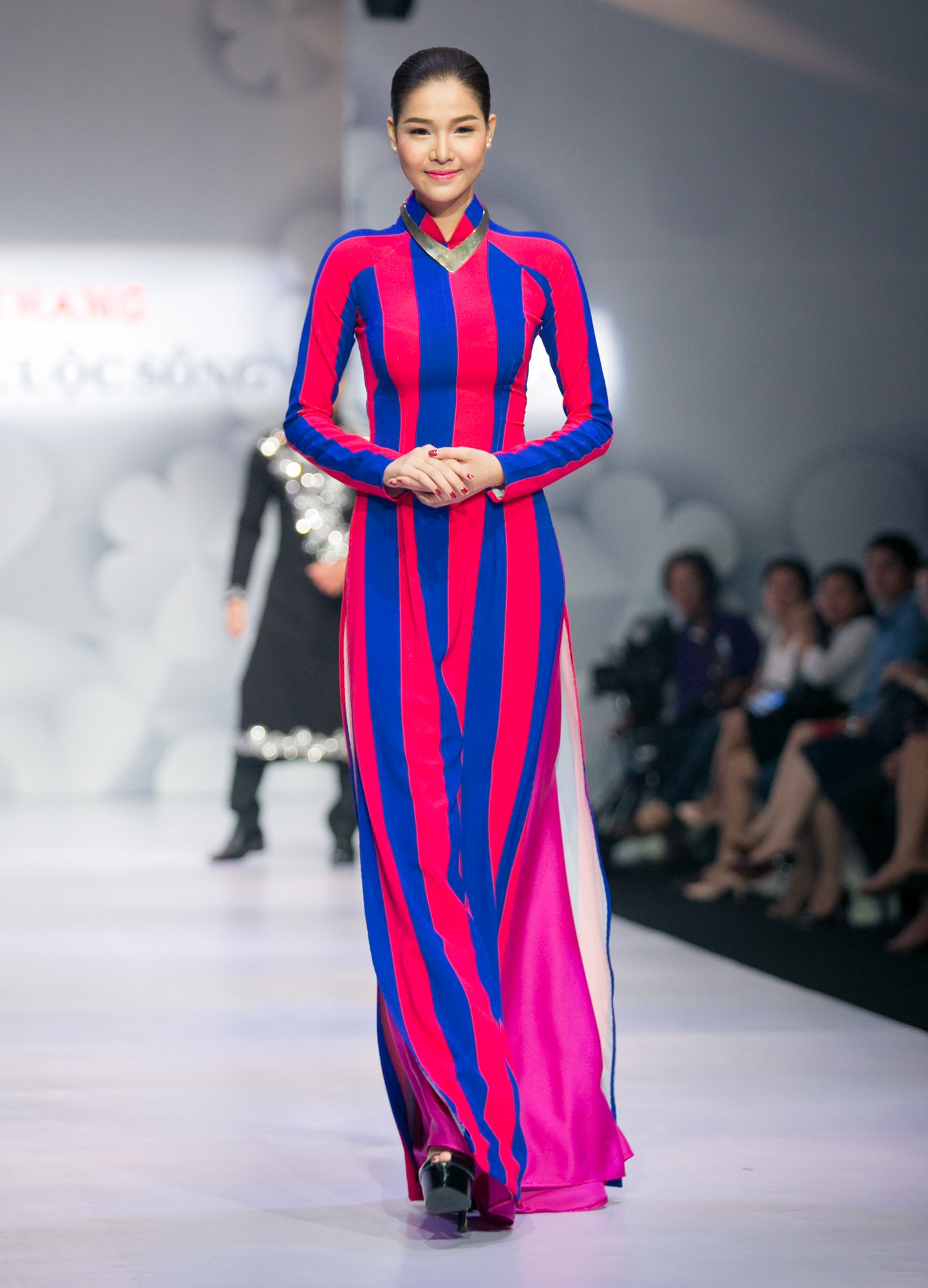 | Anh Thư nổi bật hơn với mẫu áo dài nhiều màu sắc. Bà mẹ một con kiêu sa trên sàn diễn với phong cách tự tin, chuyên nghiệp. |