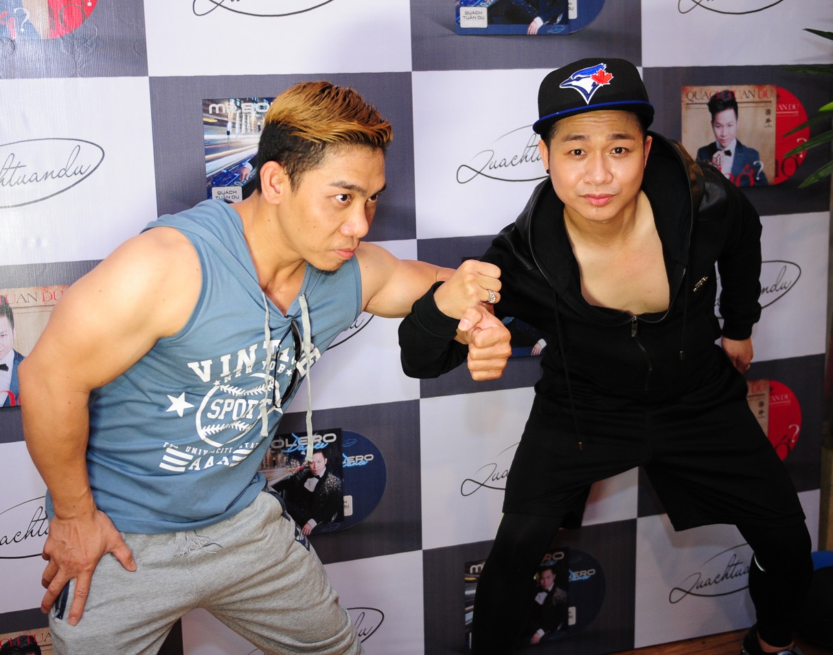 | Quách Tuấn Du đọ cơ bắp cùng lực sĩ Phạm Văn Mách. Sau cuộc thi Cặp đôi hoàn hảo 2012, lực sĩ bén duyên với ca hát và diễn xuất. |