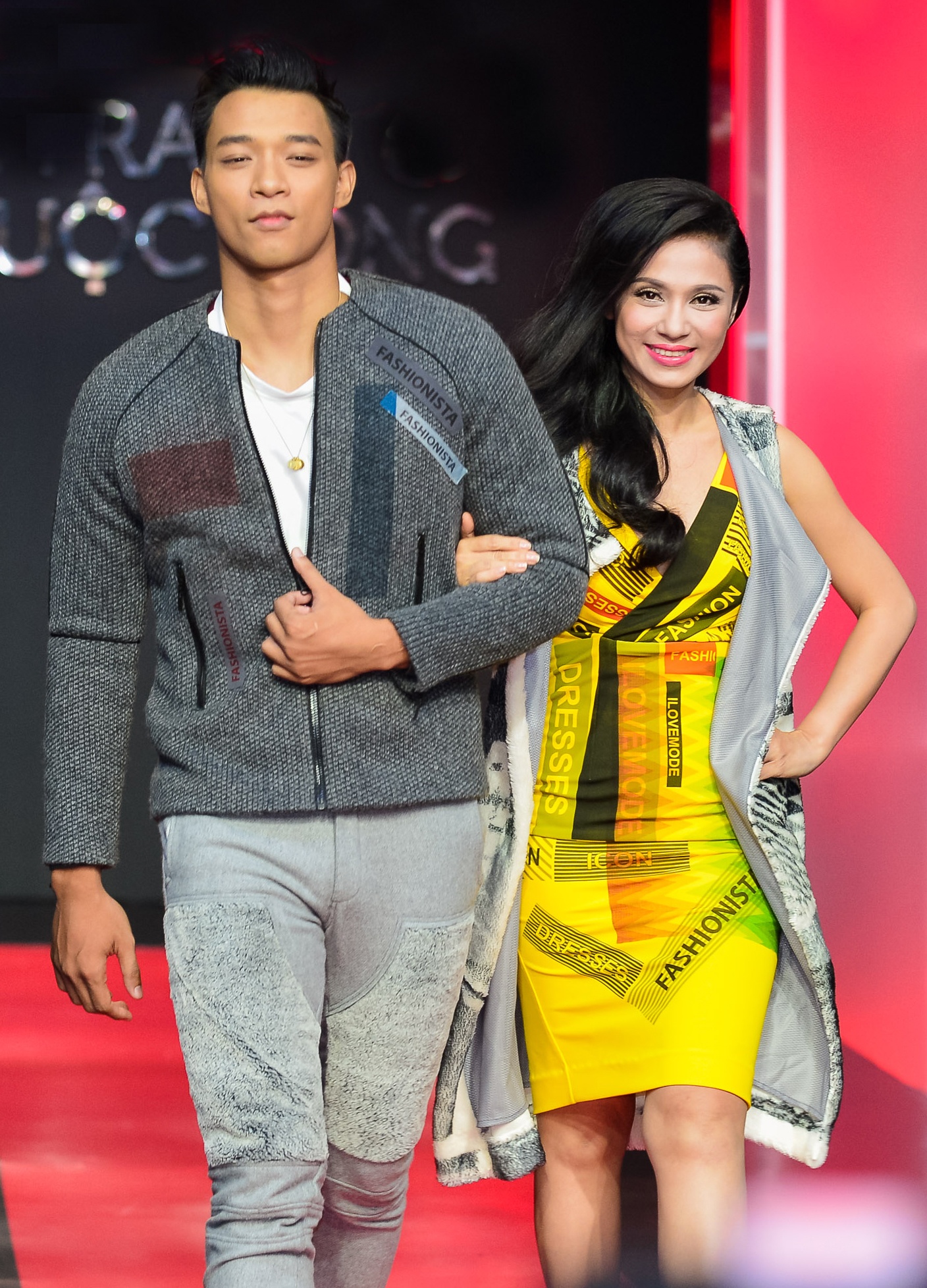 | Bà mẹ một con sải bước tự tin cạnh người mẫu Mạnh Hiệp. |