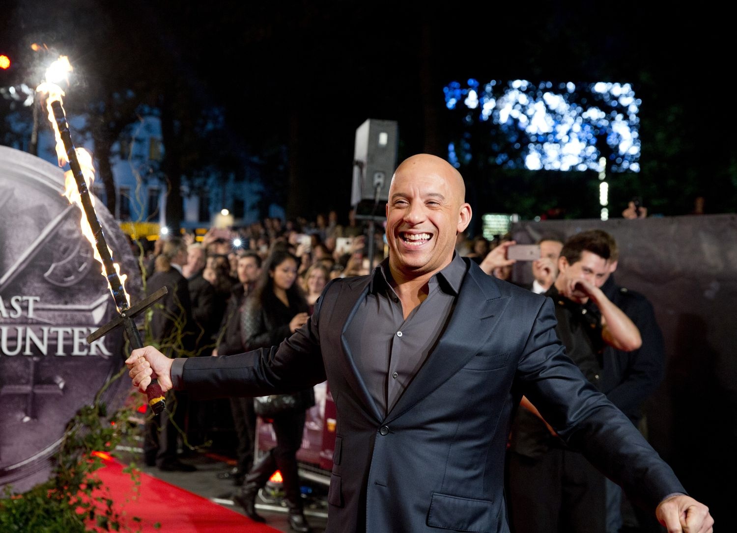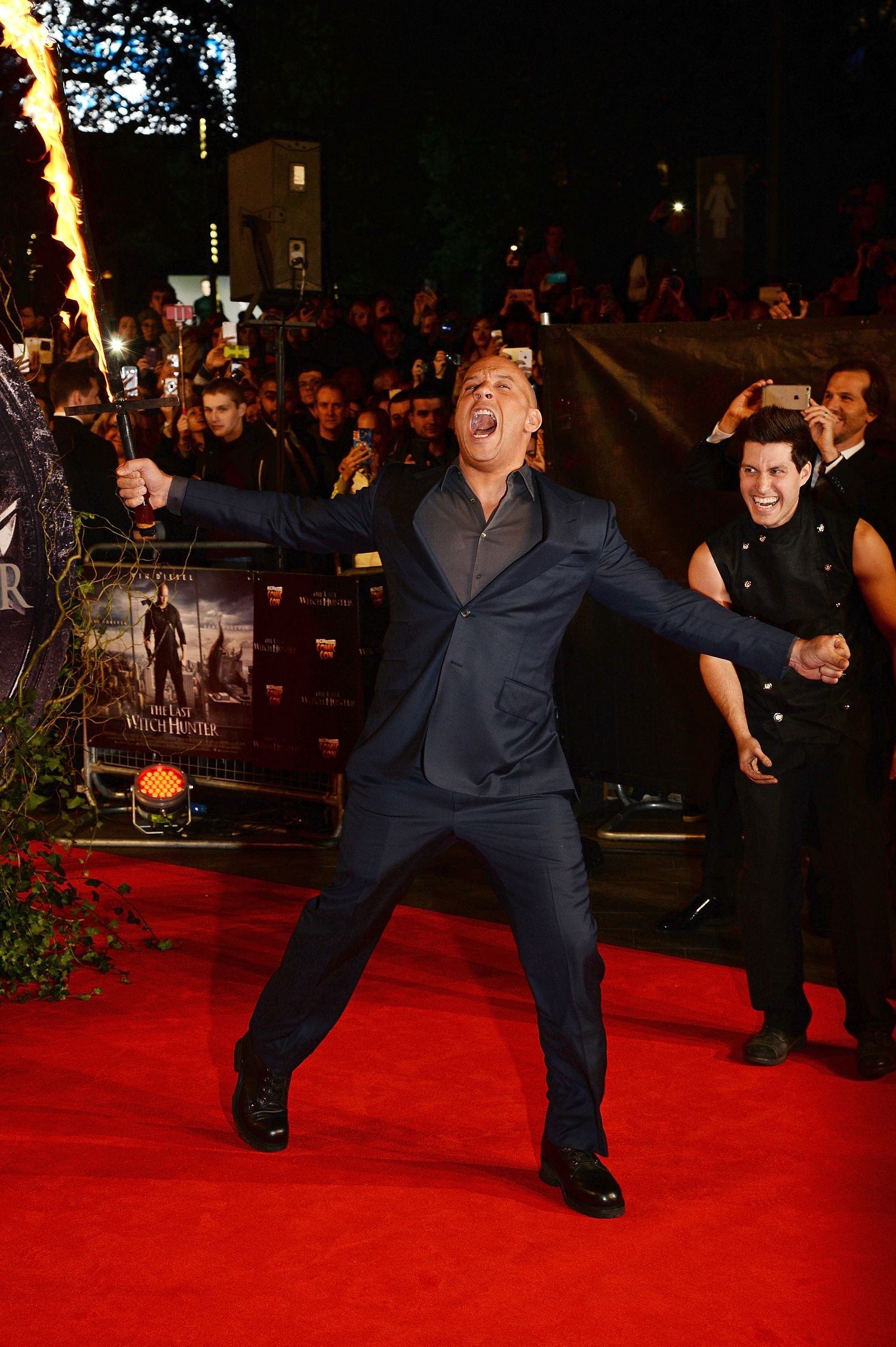 Buổi ra mắt của The Last Witch Hunter, tác phẩm hành động kinh dị lấy đề tài phù thủy của Vin Diesel, diễn ra tại quảng trường Leicester, London, nước Anh tối 20/10. Trên thảm đỏ, ngôi sao hành động khiến quan khách trầm trồ khi đem theo chiếc kiếm lửa từng xuất hiện trong đoạn trailer phim và dùng nó để vẫy chào người hâm mộ.