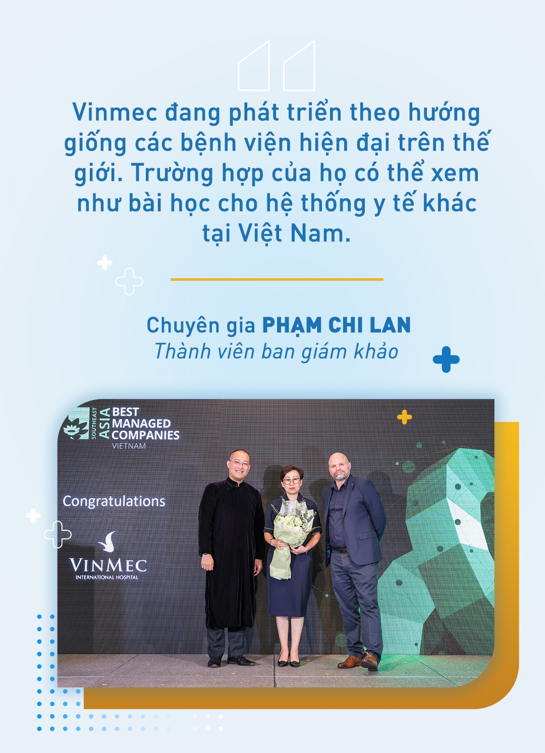 Đặc biệt, tháng 6/2022, Vinmec trở thành đơn vị y tế đầu tiên tại Việt Nam được DELOITTE trao danh hiệu “Doanh nghiệp được quản trị tốt nhất Việt Nam - Best managed companies” với các kỹ năng quản trị và thực tiễn quản lý tiên tiến. Việc “đi bằng 2 chân” - cả chuyên môn và quản trị - được xem là bàn đạp vững chắc để hệ thống này gia nhập mạng lưới doanh nghiệp tinh hoa toàn cầu và mở rộng sang các thị trường mới.