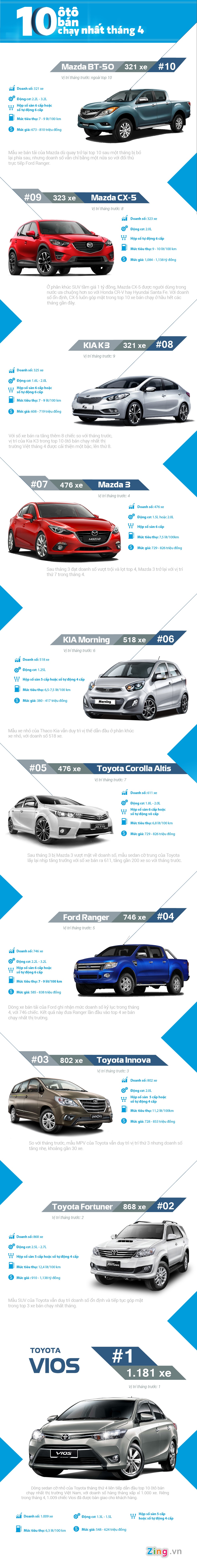 Mẫu sedan cỡ nhỏ của Toyota đạt doanh số 1.009 xe trong tháng 4. Kết quả này giúp Vios củng cố vị thế số một trong top 10 ôtô bán chạy nhất ở thị trường trong nước.