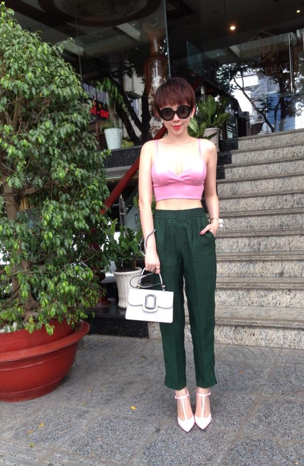 | Trong khi đó, Tóc Tiên chọn hình ảnh táo bạo khi phát huy lợi thế trang phục bó sát khoe ngoại hình đầy đặn gợi cảm. Đi kèm trang phục cá tính, nữ ca sĩ Tóc mây mang giày đế ''bánh mì'', túi Chanel, mũ lưỡi trai tạo hình ảnh năng động. |