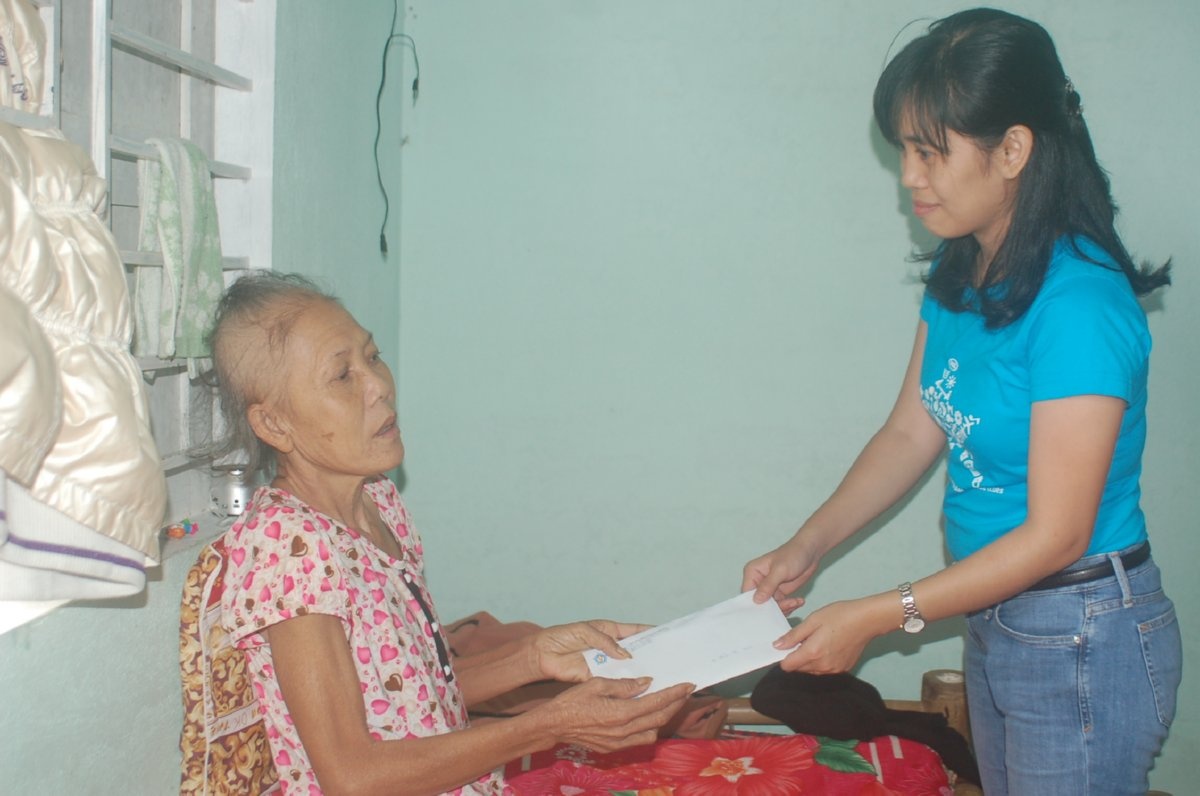 | Bà Đoàn Đỗ Ngọc Thi thăm và trao quà cho bà Trần Thị Mười bên giường bệnh tại căn nhà bà Mười đang ở nhờ, xã Điện Dương, huyện Điện Bàn, tỉnh Quảng Nam |