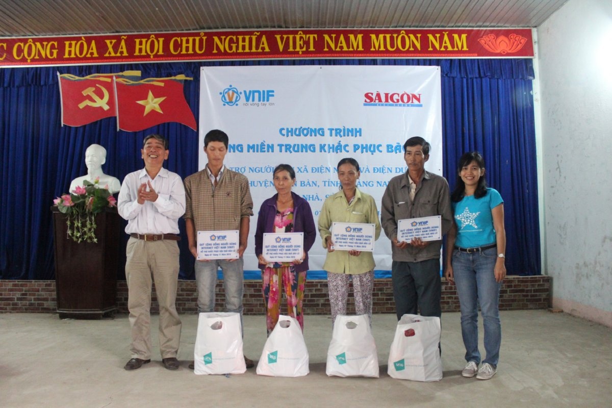 Đến gặp và trao quà tại nhà bà Trần Thị Mười, bà Đoàn Đỗ Ngọc Thi, Giám đốc điều hành VNIF, xúc động: “Hơn nửa tháng sau khi cơn bão số 11 đi qua, nhiều người dân địa phương ở đây vẫn lâm vào cảnh màn trời chiếu đất, nhà tốc mái, nhà sập mà chưa có đủ tiền để xây hay sửa lại, vợ chồng con cái phải chia ra mỗi người ở một nơi. Đặc biệt, có những trường hợp như cô Trần Thị Mười, chồng qua đời, bản thân bị bệnh ung thư, con thì còn đi học, gia đình vốn đã lâm vào cảnh nợ nần mà nay nhà bị tốc mái, không có tiền lợp lại phải ở nhờ nhà hàng xóm. Những mảnh đời đó đã thúc đẩy chúng tôi kêu gọi sự góp sức của cộng đồng người dùng Internet để đến với những người không may mắn ở mảnh đất anh hùng Điện Bàn này”.