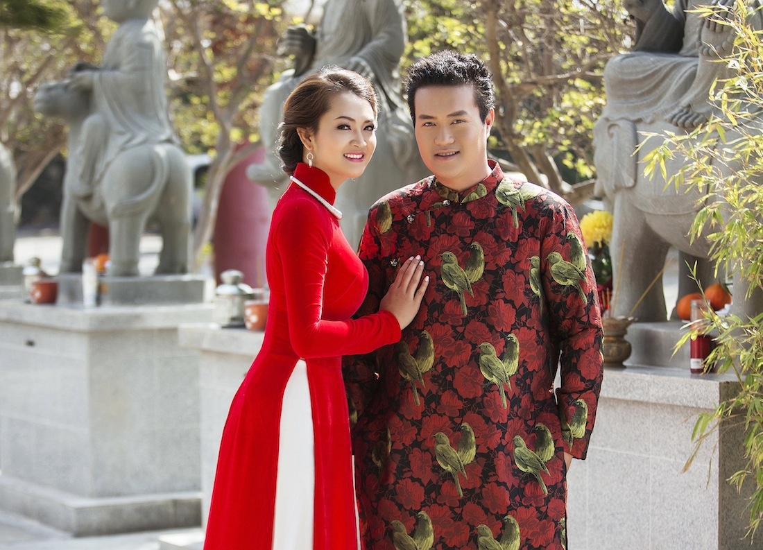 | Cặp đôi chọn tà áo dài dân tộc của NTK Sơn Collection cho bộ ảnh. |