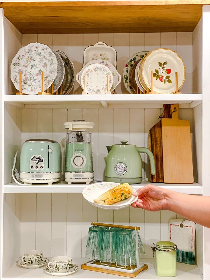 Góc nổi bật và được chủ nhà yêu thích nhất phải kể đến bộ tủ trắng đựng ly, chén. Từ cái chén, đĩa hay ly bé nhất cũng tuân thủ đúng quy tắc chọn màu. Cân đối được phong cách chủ đạo, giá và công dụng của từng món đồ trang trí khi mua sắm là cách dễ dàng nhất để bạn thêm yêu căn bếp của mình. |